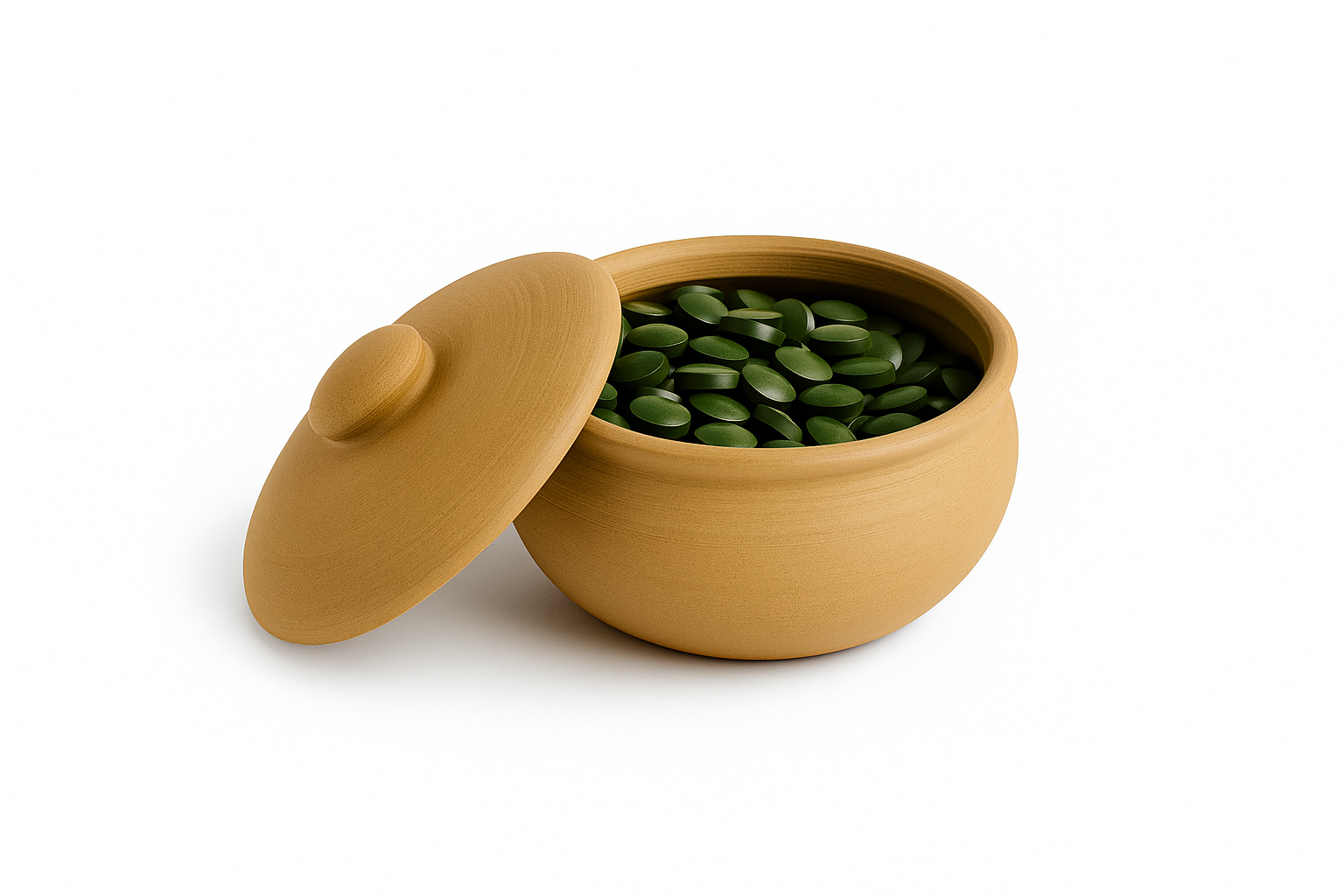 Robuste, runde Steingutdose mit fest schließendem Deckel. Perfekt zur Aufbewahrung von Chlorella- oder Gerstetabletten – praktisch für unterwegs oder zu Hause.